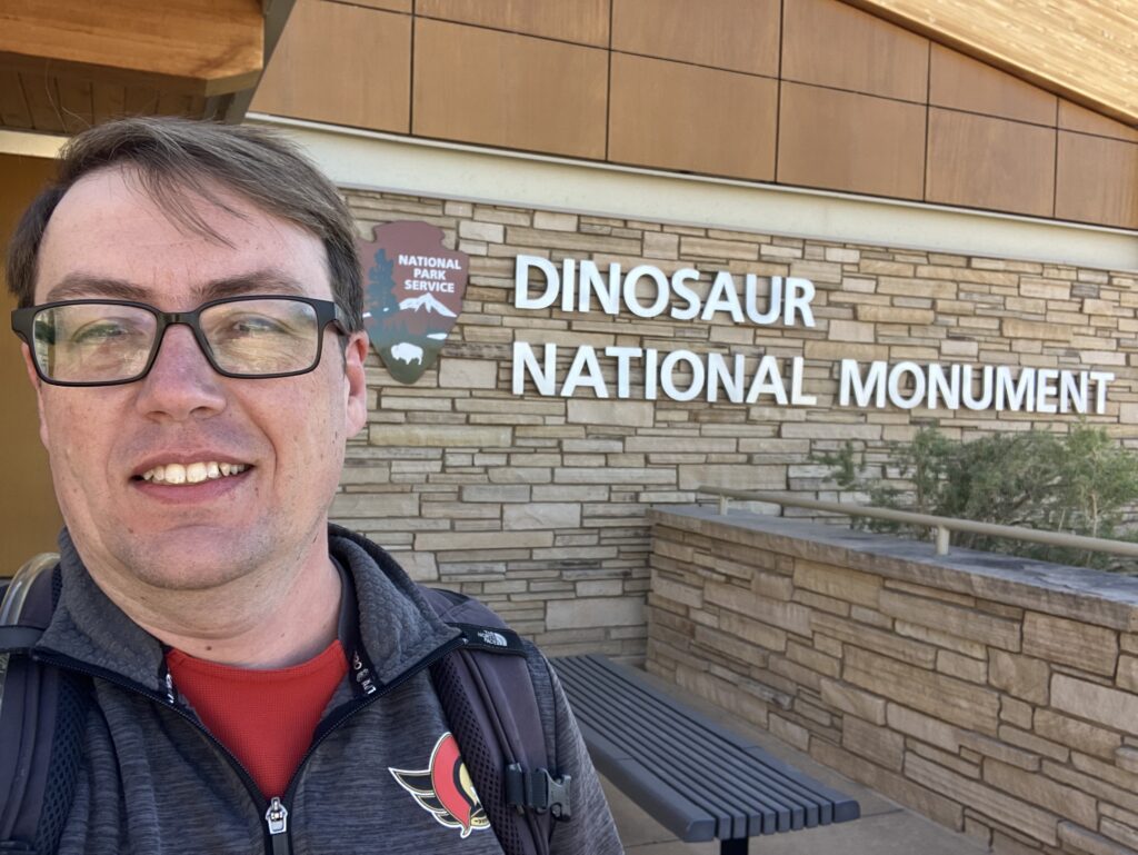 In the Canyon Visitor Center, I chatted with some fellow ice hockey fans of the Colorado Avalanche who were out for a week-long trip around Utah from Denver about the recently relocated team new to Utah, for now called the Utah Hockey Club and the excitement of their inaugural season this year. I also chatted with the park ranger who was attending the center to ask what I should see if I had only an hour or so to visit. She suggested that I stop in at the next visitor center down the road at the Quarry Visitor Center near Jensen, Utah about 20 miles (30 km) farther up the road to check out both a short hike, and a display of dinosaur fossils there. With that advice in hand, I bid the touring hockey fans adieu and jumped back on the bike to go see dinosaurs!